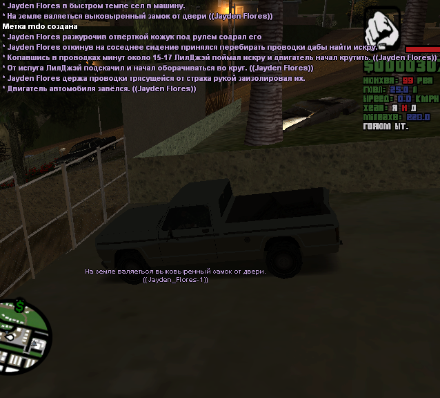 Покидав инструменты в ящичек под сидением мотоцикла отправился в район "Los Florres" т.к там он ещё не засветился ни разу. Приехав на незнакомый район ЛилДжэй начал осматриваться по сторонам в поисках какой либо развалюхи, в глаза ему кинулся старенький разбитый пикап. Резко нажав на тормоз ЛилДжэй остановился и принял решение что будет его брать.
